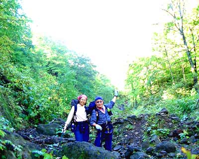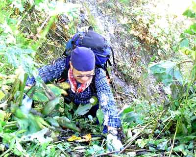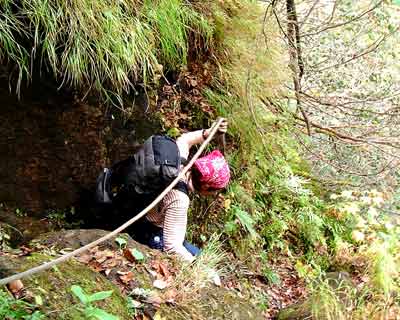 登山口から少しの間は、樹林帯の歩きやすい登山道となっているが、約15分で最初の難関ロープ場にさしかかる。下がスッパリと切れ落ちた川の岩場に2カ所ほどロープが張ってあり、ロープをしっかり握りしめて、慎重に岩場を進む。高所恐怖症クラブ会員の私は、なるべく下を見ないように素早く通過した。2カ所目のロープ場から先は、斜面が大規模に崩壊しており、川辺までかなりの高さを慎重に下る。その後の登山道は、山登りというよりは、沢登りといった状態で、何度も渡河を繰り返しながら、ごく最近移動したと思われる巨大な岩(インディージョーンズに出てくる巨大な丸い岩にそっくり)を避けながらの登りとなる。以前はもっと登りやすい登山道が整備されていたそうだが、一昨年の洪水でほとんど登山道が流されてしまったそうだ。そのせいで、所々に残る赤ペンキの登山道の誘導を信用して登っていくと道がとぎれている場所が多く、その場でのルートの判断が要求される。