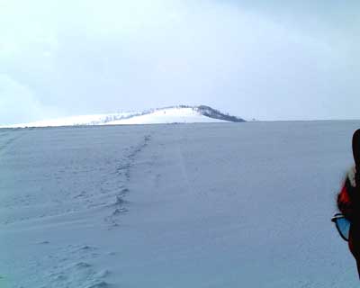 しばらく、メンバーで相談したが、この地点から登るとかなりの距離の林道歩きを強いられるため、ルスツスキー場を過ぎた地点の畜産公社の富岡農場からのルートを検討することとなり、来た道を引き返し、農場の最終除雪地点へ向かう。 こちらの最終地点から見る竹山は、かなり遠く、GPSのデータでは直線で5キロあることが解る。 メンバーで最終的に相談した結果、林道歩きが長いが安全性の高い登川温泉奥の最終除雪地点から竹山山頂を目指すこととなる。