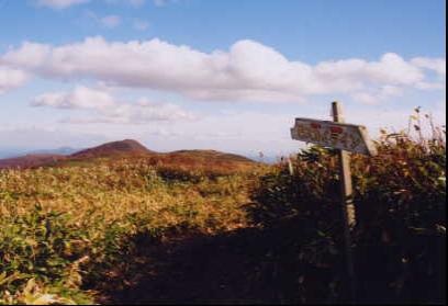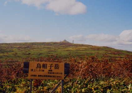 巴スカイラインを進むとすぐに道が二股に分かれており、左側には「慰霊碑」入り口の看板があり、もう一方の道を直進すると烏帽子岳へと続くが、慰霊碑への道も、慰霊碑経由で元の道に合流するので、心配無用である。慰霊碑は、昭和三十年代に亡くなった営林署の2名の職員の方のもので、かなり古いものだが、よく手入れがされていて、よく見なければ最近出来たものと勘違いしそうだ。烏帽子岳へ向かう巴スカイラインの両側は低い笹原となっており、烏帽子岳までは、かなり広い、緩やかな斜面が広がっている。道はよく整備されていて、アップダウンもごく僅かでハイキング気分で、遠くに広がる噴火湾や駒ヶ岳の素晴らしい眺望を楽しみながら進む。