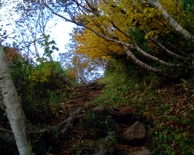 同じメーリングリストのどさんこのりさん、リンク仲間のKさんとの「オフミ」登山を企画し、函館と札幌のほぼ中間地点でということで、羊蹄山での避難小屋に一泊し懇親を深めることになった。 午前10時に真狩登山口に集合と言う約束で自宅を6時45分に出発したものの、途中車の流れが悪く結局約束の時間に15分程遅れてしまった。 すでに、どさんこのりさんKさんは、準備を整えて待っていた。 Kさんとは、今年の富良野岳〜上ホロカメトック縦走以来の再会である。 そそくさと、身支度を整えて10時20分に登山開始する。 今回は、避難小屋一泊と言うことでシュラフ、マット、ガスバーナー、コッヘル、水、そして夜の宴会用の酒(ビール1リッター、ワイン1リッター........)と55リットルのザックにほぼ満載の荷物となり、おそらく総重量は15キロを超えているであろう。 正確に重さを量ろうとも考えたが、登りの最中苦しくなった時に背中に何キロが〜と思うとかえってプレッシャーになると考え、あえて重量を計らなかった。 重い荷物を担ぎながら、単調な登りをひたすら進む。 先頭を務めるのりさんは、さすが「まだ」20代だけあって、「ぐいぐい」とハイペースで進み、年齢的には大先輩?!のKさんも最近会得した「テーピング効果」?で、のりさんと変わらない元気な登りを見せている。 このペースで登ると、確実に足に来ると判断し、途中からマイペースの登りに切り替えることとする。 前回も長いと感じた羊蹄山の登山道は、ジグザグを繰り返し、