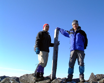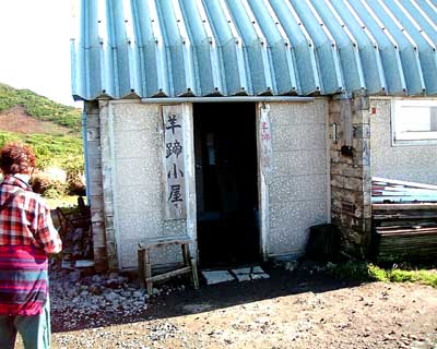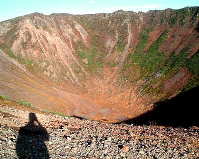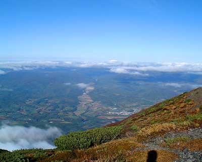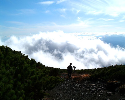 腰が引けたまま東側ピークでも記念写真を撮って、避難小屋に引き上げる。 すっかり静かになった小屋に戻って、一休みした後、9時45分に避難小屋を出発する。 さすがに昨夜、競って軽くした甲斐があって、登ってきた時に比べてザックが軽いのが嬉しい。 青空の中、快調なペースで下山を開始するが、昨日の登りの後遺症か、6合目を過ぎたあたりから、足が重くなって来た。 他の2人も足に来ているとのこと。 やはり、羊蹄山はきつい山なのだと実感する。 重い足を引きずりながらようやく12時20分登山口到着。