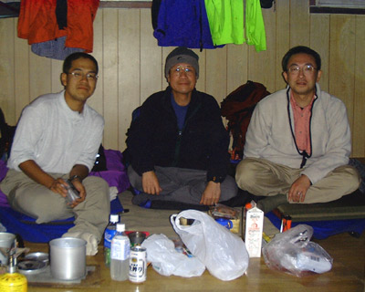 避難小屋には、管理人と先客が1人のみで、まだ静かである。 一番静かそうな奥に3人で陣取り一応シュラフとマットを取り出して今夜の寝床を確保する。 小屋の中は、予想以上に清潔で、しかも入り口付近のコークスストーブが焚かれていて、外とは別世界の暖かさとなっている。